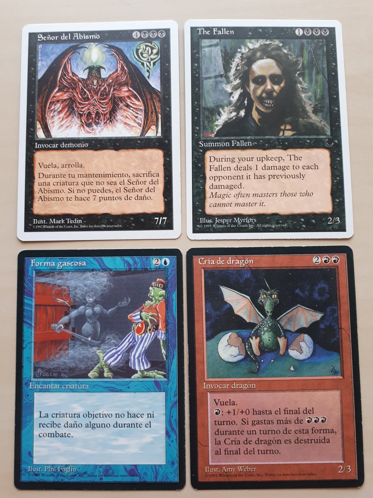 Por otro lado, una cosa que todo jugador agradecía es que las cartas útiles no eran solo las raras (de hecho, había raras que no verían juego nunca). En cambio, cartas muy útiles como Relámpago, Dark Ritual, Disenchant, Blue Elemental Blast, Fireball, Chain Lightning, Hymn to Tourach o Goblin Grenade entre otras, eran comunes. Por supuesto, también había infrecuentes poderosísimas: Counterspell, Swords to Plowshares, Regrowth, Demonic Tutor, Hypnotic Specter, Sol Ring, Black Vise, Mana Drain, Strip Mine, Serra Angel, Sengir Vampire…