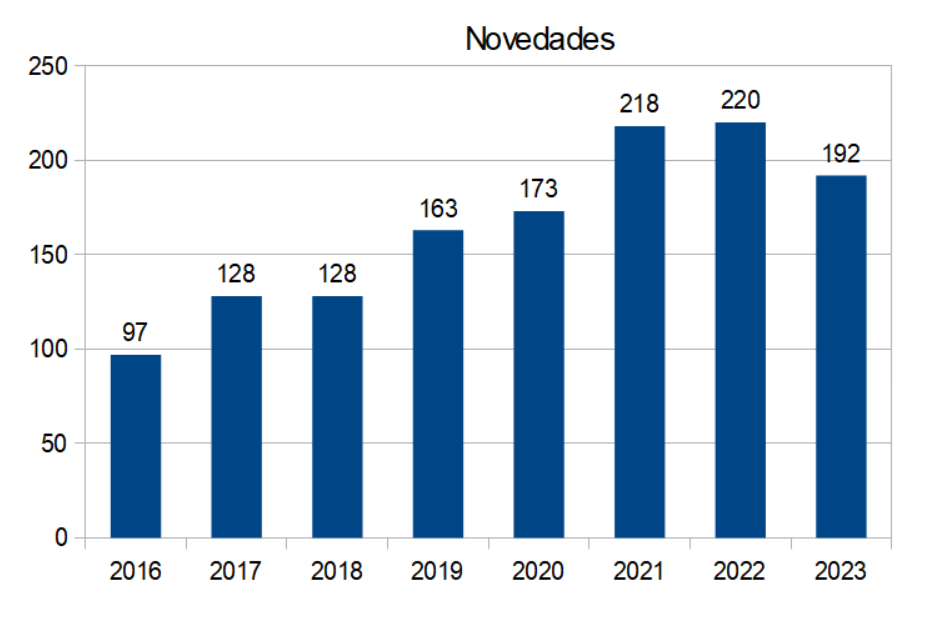 El año pasado varios amigos ya apuntamos que este crecimiento constante no iba a poder mantenerse indefinidamente y que algún año se llegaría al tope. Pues bien, parece que ya se ha llegado y en estos momentos ese techo está en 2022 con 220 novedades.
